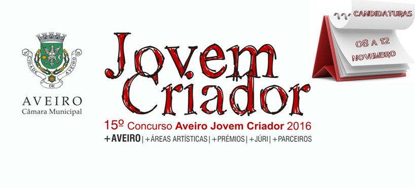 A Câmara Municipal de Aveiro encontra-se a promover o Concurso Aveiro Jovem Criador 2016, dirigido a jovens artistas dos 13 aos 17 anos e dos 18 aos 35 anos, nas áreas de: Arte Digital, Escrita, Fotografia, Música e Pintura.